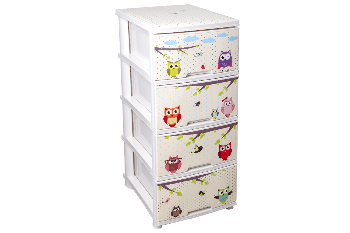 Prefabricated 4-section chest of drawers is designed for storing things, shoes, children's toys, stationery and sewing supplies, household items, etc. Durable and reliable, resistant to moisture, easy to clean, which allows you to use a chest of drawers in the kitchen, in the nursery, In the bathroom, balcony, garage, utility rooms. The maximum load per 1 box is 5 kg, and on the entire chest 25 kg. The chest of drawers is easy to assemble and disassemble, detailed instructions will help you gather for 10 minutes without much effort. The front of the chest is made in IML technique. The image is resistant to mechanical influences. From the proposed decors, you can always choose the one that you like. To complement the interior of your room you can use a rubbish bin «Euro» 10L and 18L with a decor