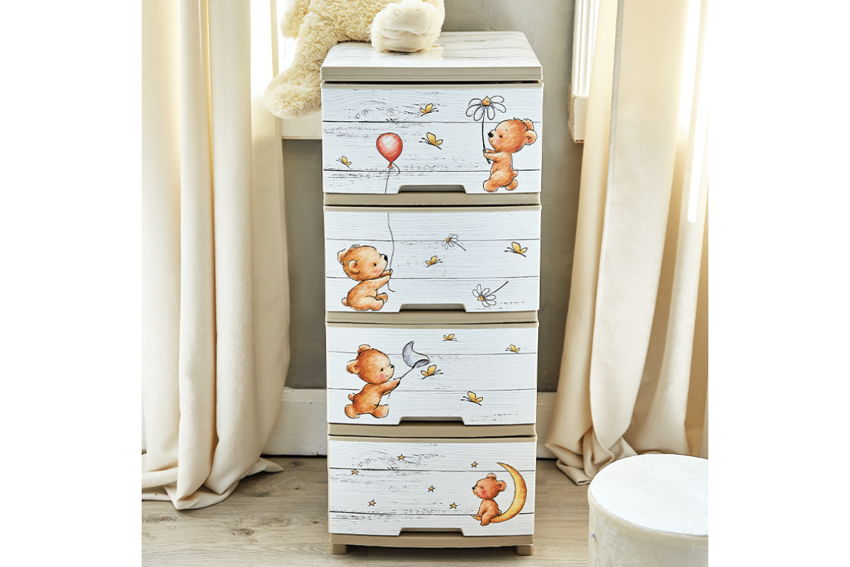 Комод с декором на 4 ящика подходит для хранения гардероба, мелких хозяйственных вещей, документов, детских игрушек, канцелярии, принадлежностей для шитья и любых других бытовых предметов. Учитывая что пластик не поддается воздействию влаги и действию температур, комод можно разместить в ванной комнате или на кухне. Сдержанный дизайн комода с декором гармонично дополнит профессиональную мастерскую или специализированное рабочее место. Конструкция комода на 4 ящика с декором очень проста - собрать полностью весь комод можно в течение 7-10 минут. Декор передней части комода выполнен в соответствии с технологией IML. Декор устойчив к любым механическим воздействиям и не выцветает со временем. В ассортименте на выбор представлены различные варианты декора. Прочный, надежный и неприхотливый в уходе комод с декором на 4 ящичка станет настоящим украшением интерьера любого помещения.